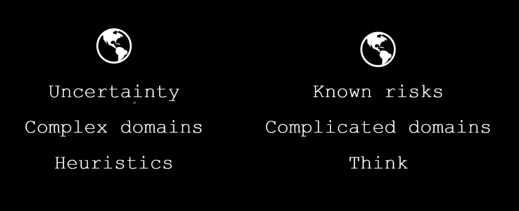 When I say complicated domain, I’m referring to the Cynefin model that helps you making sense of the world and assist you when making decisions. Combining Kahneman’s System 1 and System 2 with the Cynefin model helps me categorizing, and determine when I should celebrate heuristics and trust my gut, or actively address my system 2 and think.